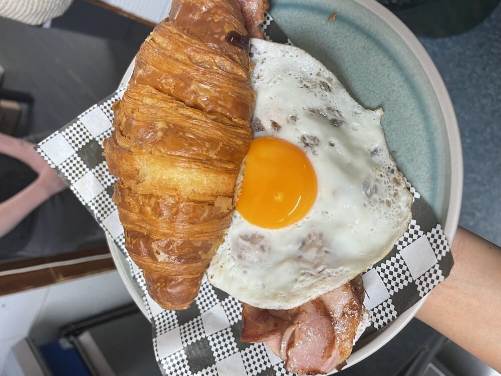 Fried egg, bacon, swiss cheese, hash brown, caramelised onion and barbeque sauce.
