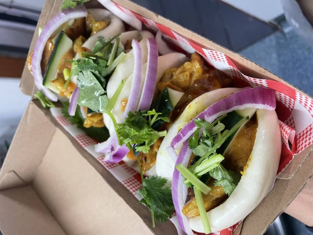 Slow cooked beef in Thai Massaman curry sauce, topped with lettuce, tomato, red onion, sour cream, tasty cheese, parsley in soft tortillas.
