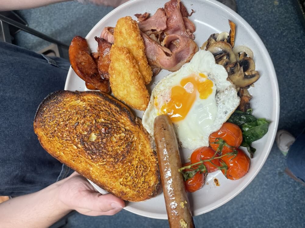 Egg cooked your way, chorizo, mushroom, spinach, tomato, sausage, hash brown and bacon