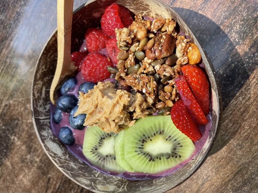 Acai smoothie topped with berries, banana, coconut flakes, chia seeds.