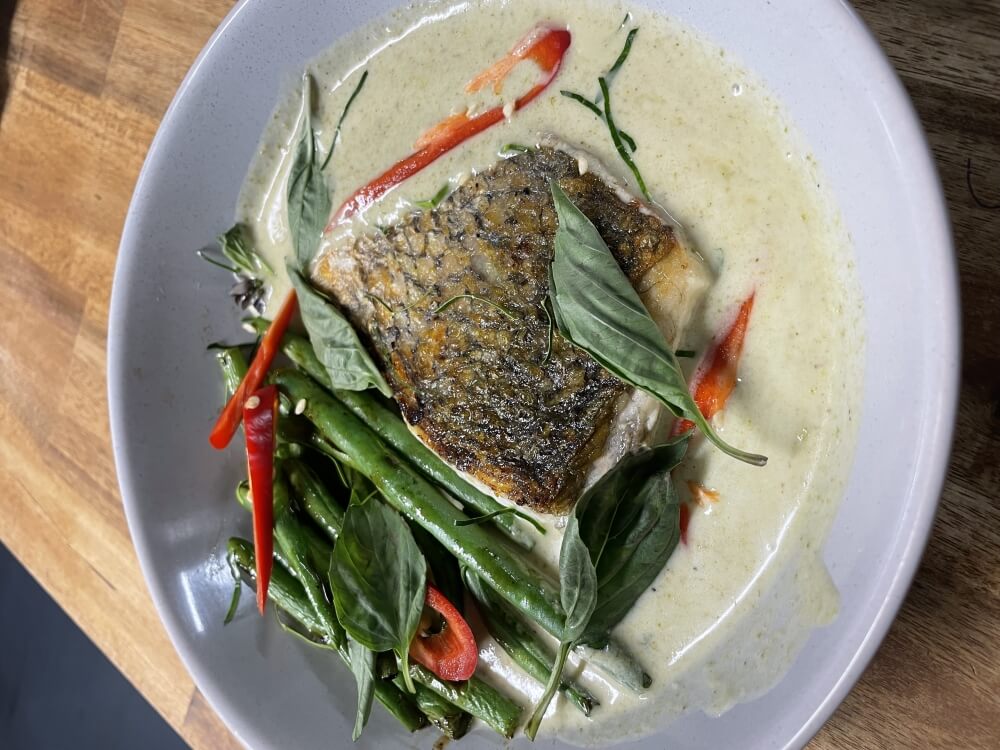 Perfectly cooked Barramundi infused with coconut milk, herbs, spice with a hint of Thai chilli paste and topped with fresh basil. Served with green bean and jasmine rice.