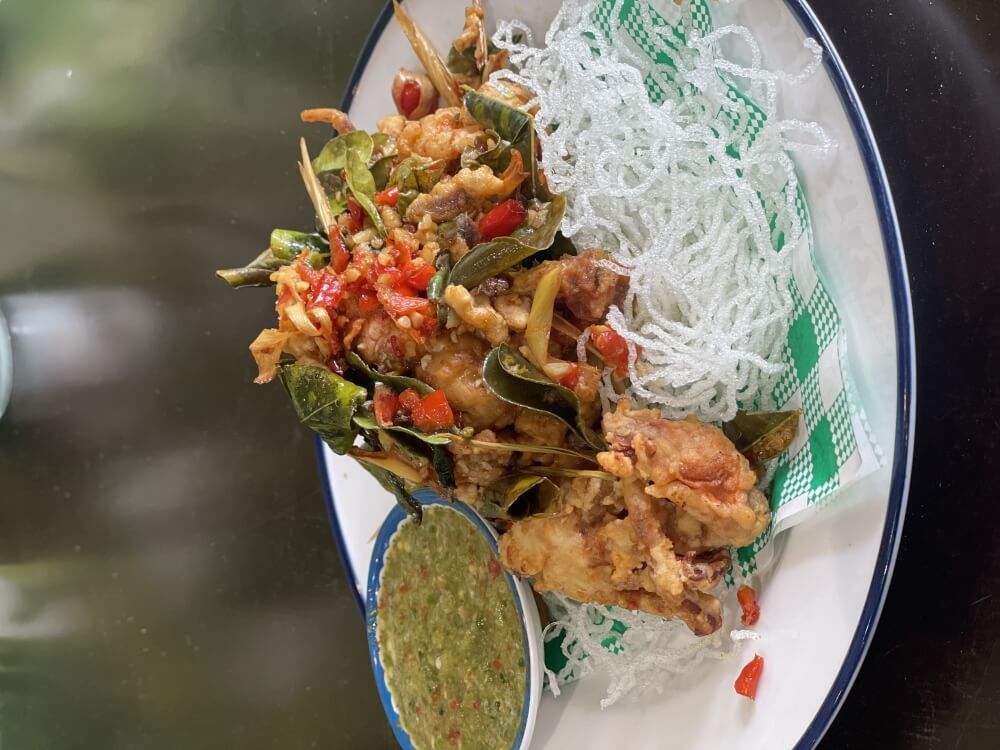 Deep-fried soft-shell crab mixed in chilli garlic, crispy kaffir lime leaf, lemongrass and basil. Served with Thai style chilli & Lime sauce.